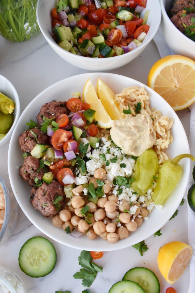 Gyro Meatball Bowls có mì ống orzo với thịt bò có hương vị, cà chua, hành tây đỏ, dưa chuột, đậu garbanzo, hummus, feta, v.v.…